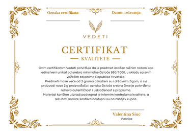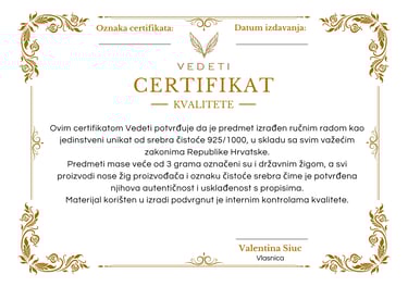 Vedeti je ponosni vlasnik žiga proizvođača i Certifikata kvalitete kojim jamči čistoću srebra svojeg srebrnog nakita (za dodatna pojašnjenja oznaka čistoće srebra kliknite OVDJE) te unikatnu i ručnu izradu svih svojih modela. Predmeti izrađeni od Silver Art Clay 999 testirani su na Državnom zavodu za mjeriteljstvo i rezultati analize dostupni su na zahtjev klijenta.